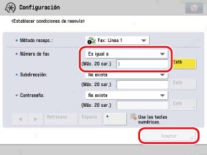 Seleccione [Es igual a] para el número de destino → escriba el número de fax del remitente → pulse [Aceptar].