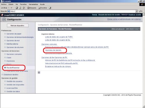 Acceda a la IU remota → haga clic en [Configuración] → [Recepción/Reenvío] → [Opciones de reenvío].