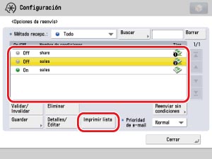 Seleccione la condición de reenvío para imprimir → pulse [Imprimir lista].