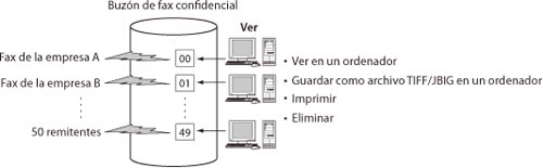 El buzón de fax confidencial, al igual que el buzón de RX en memoria, guarda temporalmente documentos recibidos vía fax, fax por Internet, o fax por Intranet.