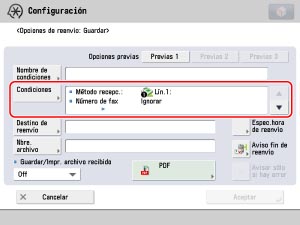 Pulse [Condiciones] → seleccione [Fax: Línea 1] de la lista desplegable <Método recepc.:> → pulse [Aceptar].