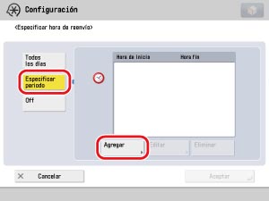 Pulse [Espec.hora de reenvío] → especifique la hora y el día en que se cumplirá la condición de reenvío.