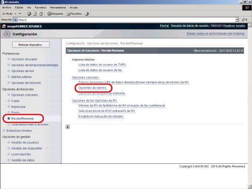 Acceda a la IU remota → haga clic en [Configuración] → [Recepción/Reenvío] → [Opciones de reenvío].