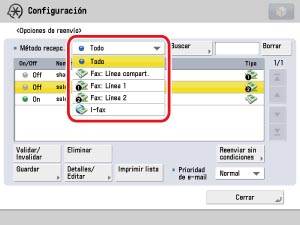 Si está instalada la Tarjeta de Fax Súper G3 2ª Línea, se pueden especificar diferentes opciones de reenvío para cada línea de fax (líneas de fax 1 y 2).