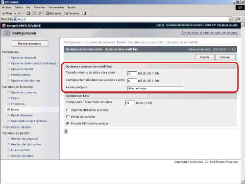 → [Opciones de funciones] → [Enviar] → [Opciones de e-mail/I-fax] → [Opciones de comunicación].La función I-fax de los equipos imageRUNNER ADVANCE utiliza el protocolo SMTP para transmisión.