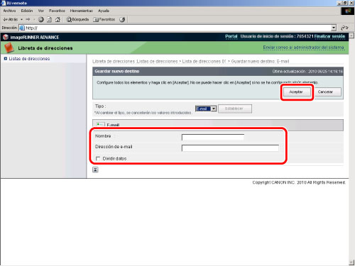 Dirección de e-mail adquirida para el equipo imageRUNNER ADVANCE