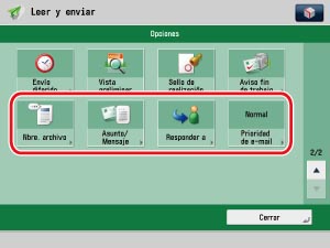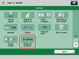 Solamente podrá seleccionar las opciones previamente almacenadas para "Nombre del remitente" y "Responder a". No puede introducir un nuevo destino en la pantalla Opciones. Guarde el destino en Configuración. El "Nombre del remitente" mostrado en la pantalla de recepción es el nombre de unidad establecido para el equipo imageRUNNER ADVANCE que está enviando. La opción "Nombre del remitente" no se refleja.