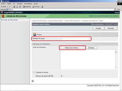 Seleccione el destino recién guardado [grupo1] → pulse [Aceptar].