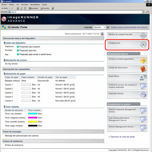→ [Enviar] → [Registro] → compruebe que el trabajo se envió correctamente.