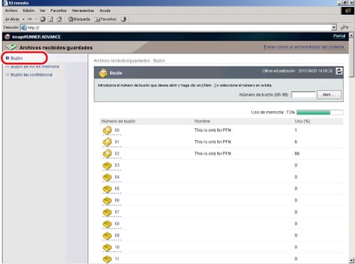 Acceda a la IU remota → haga clic en [Archivos recibidos/guardados] → [Buzón] → haga clic en el número del buzón en el que desee establecer envío a URL.