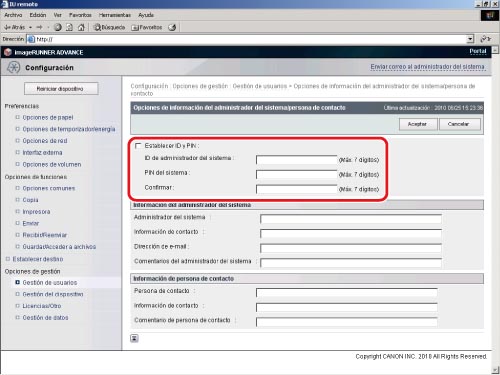 Acceda a la IU remota → haga clic en [Configuración] → [Gestión de usuarios] → [Opciones de información del administrador del sistema/persona de contacto].