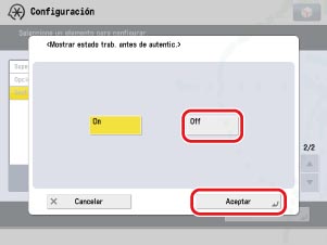 Pulse [Mostrar estado trab. antes de autentic.] → [No] → [Aceptar].