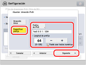Pulse [Especificar prefijo] → introduzca 'fec0:0:0:1::1234' en [Prefijo de IPv6] → '64' en [Longitud de prefijo] → pulse [Siguiente].