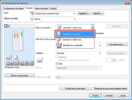 En la hoja [Acabado], seleccione [Impresión a una cara] en [Estilo de impresión].