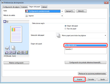 Seleccione el origen del papel que contiene las etiquetas → haga clic en [Aceptar].
