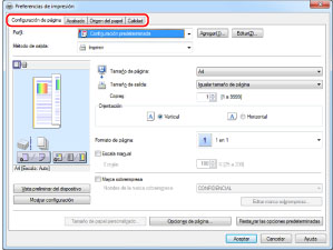 Haga clic en las fichas [Configuración de página], [Acabado], [Origen de papel], y [Calidad] para especificar las opciones necesarias.