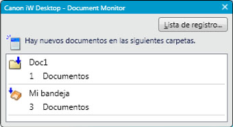 Puede utilizar Document Monitor para monitorizar las carpetas de Espacio avanzado. Si se configura la monitorización de carpetas con iW Desktop y se habilitan las notificaciones de nuevos documentos, aparecerán un icono de notificación de nuevos documentos y una ventana cuando se guarde un documento en una carpeta de Espacio avanzado.