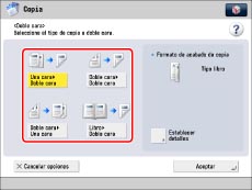 Doble cara], siga las instrucciones que aparecen en la pantalla para leer cada cara de los originales.Si desea poner el original de doble cara en el cristal de copia para hacer copias con [Doble cara