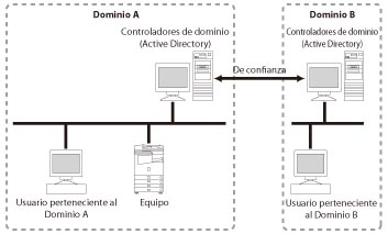 Los usuarios pertenecientes al Dominio A (que incluye el equipo) y usuarios pertenecientes al Dominio B (que es considerado como un dominio de confianza bidireccionalmente por el Dominio A); también se pueden autenticar usuarios registrados en el propio equipo. Al iniciar sesión, el usuario selecciona la ubicación en la que va a iniciar sesión (nombre de dominio o [Este dispositivo]).