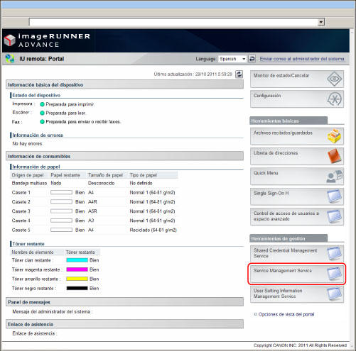 Haga clic en [Service Management Service] en la página del portal de IU remota.