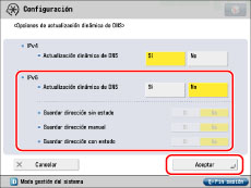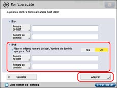 Si establece <Usar DHCPv6> en 'On' en el paso 7, se sobrescribirá el nombre de dominio que haya establecido manualmente. Aunque establezca <Usar el mismo nombre de host/nombre de dominio que para IPv4> en 'On', se utilizará el nombre de dominio obtenido del servidor DHCPv6.