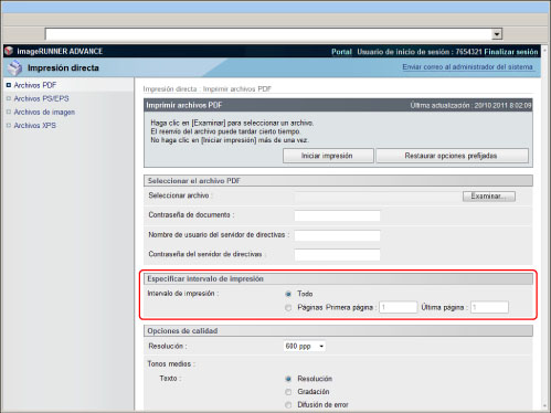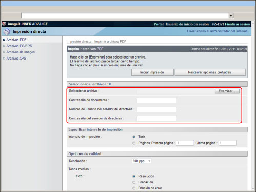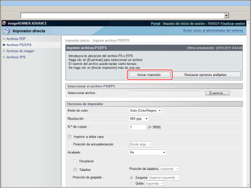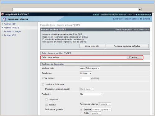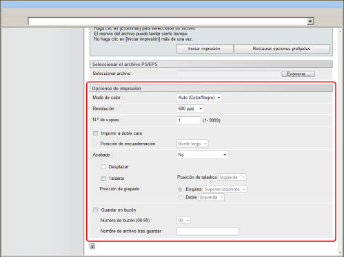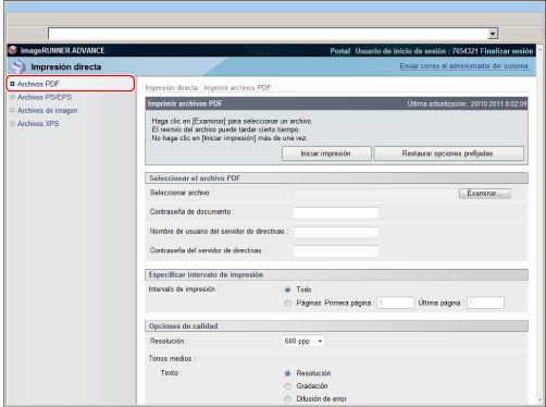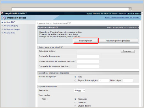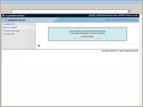 Se requiere el Kit de Impresora PS o Kit de Impresión Directa (para PDF/XPS) para imprimir un archivo PDF sin abrirlo. El Kit de Impresora PS sólo está disponible para imageRUNNER ADVANCE C7280i/C7270i/C7260i.