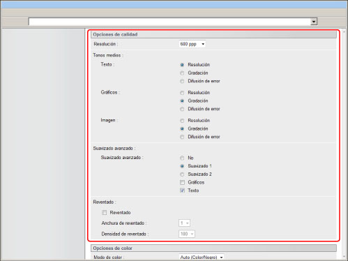 Las opciones para "Gráficos" y "Texto" de esta opción sólo serán efectivas si 'Printer Default' se ha establecido para Suavizado avanzado en el controlador de impresora.