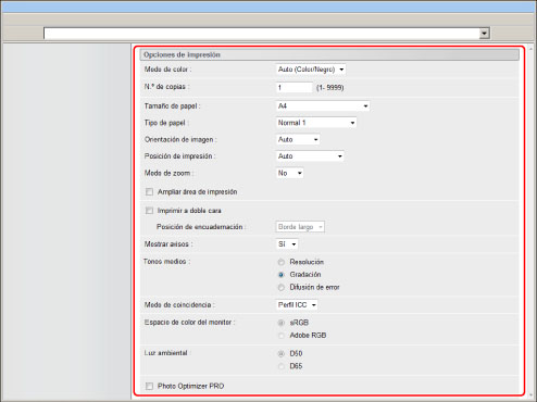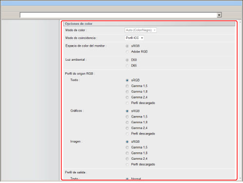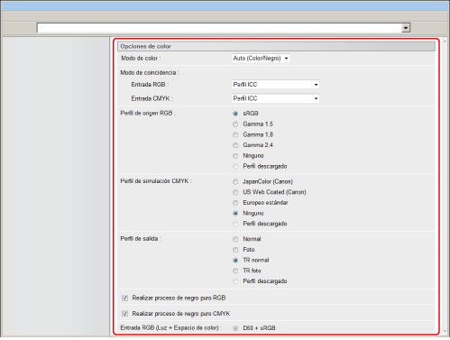 Esta opción le permitirá especificar el perfil RGB (datos de color representados utilizando el modelo de colores RGB (Red Green Blue (rojo, verde, y azul))) que sea apropiado para las características de su monitor. Esta opción se aplica cuando se imprime un documento que contiene imágenes o gráficos en color hechos con el modelo de colores RGB.