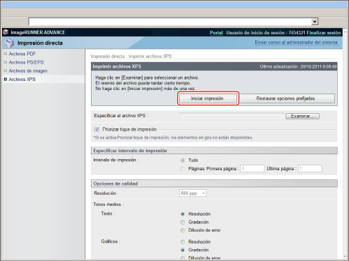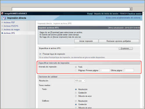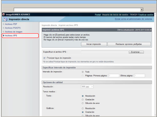 Si el tamaño de página del archivo XPS excede el tamaño máximo o mínimo del papel definido por el usuario, se cancelarán los trabajos. (No se incluirán en el cómputo de impresiones.) |