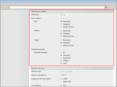 Seleccionando para 'Gráficos' y 'Texto', podrá seleccionar el aplicar o no suavizado a datos de gráficos o de texto.