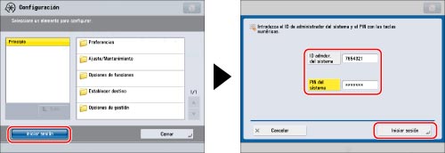 Si está utilizando Gestión de ID de departamentos como servicio de inicio de sesión del equipo, las operaciones que pueden llevar a cabo los usuarios generales en la pantalla Configuración están restringidas. Para poder utilizar todos los elementos de la pantalla Configuración, introduzca un ID de administrador del sistema y un PIN del sistema para iniciar sesión como administrador.