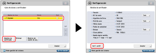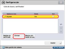 Los pares de claves para los que aparezca 'Uso' en <Estado> no pueden eliminarse porque están en uso con la autenticación IEEE802.1X/IPSec o porque está activado SSL. Pulse [Mostrar ubicación de uso] para comprobar el tipo de seguridad para el cual se usa el par de claves. Para eliminar un par de claves que sólo se utilice con SSL, desactive las siguientes opciones. Los pares de claves que se utilicen para la autenticación IEEE802.1X/IPSec no se pueden eliminar.