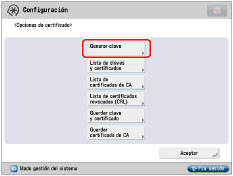 Si está desactivada la firma de usuario, no es necesario pulsar [Lista claves y certificados para disposit.]. Si pulsa [Lista de claves y certificados], la pantalla cambia a la pantalla Lista de claves y certificados.