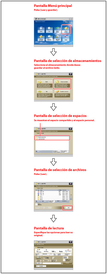Para conocer las instrucciones acerca de cómo ordenar las carpetas, consultar la información detallada del archivo y editar o eliminar archivos, consulte "Archivos guardados".