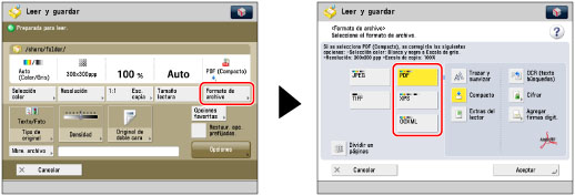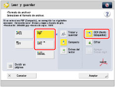 Si selecciona PDF o XPS como formato de archivo, podrá establecer al mismo tiempo [Compacto] y [OCR (texto búsquedas)]. En este caso, [PDF (Compacto)] o [XPS (Compacto)] se mostrará como formato de archivo en la pantalla Funciones básicas de Leer y enviar.