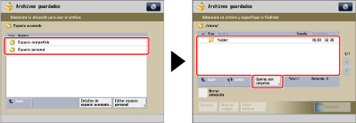 Seleccione el espacio de almacenamiento que desee → seleccione el nivel de carpeta adecuado → pulse [Operac.con carpetas].