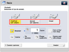 Si no se ha establecido [Acabado], las hojas saldrán de la misma forma que cuando se haya establecido [Agrupar (por páginas)]. Si está activada la función [Autoclasificar], se establecerá automáticamente el modo Clasificar o el modo Clasificar y desplazar al poner los originales en el alimentador. (Consulte "Activar la clasificación automática".) Puede hacer que se muestre la información detallada del papel seleccionado pulsando