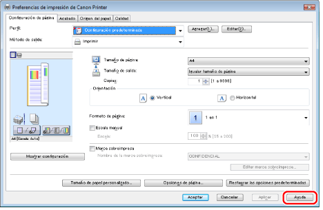 Puede mostrar la ayuda en línea haciendo clic en [Ayuda] en la pantalla del controlador de impresora.