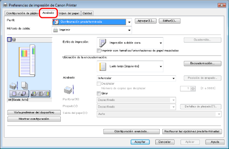 Para conocer las instrucciones acerca de cómo mostrar la pantalla del controlador de impresora, consulte "Impresión" o "Configurar las opciones de impresión prefijadas".