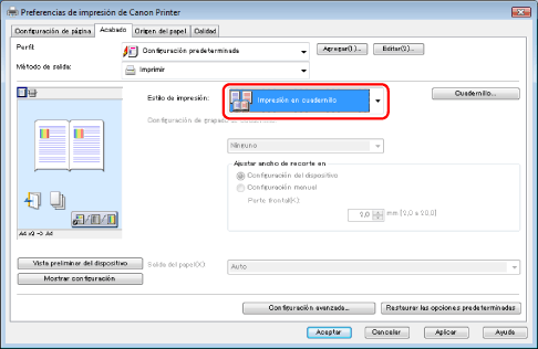 En [Estilo de impresión], seleccione [Impresión en cuadernillo].