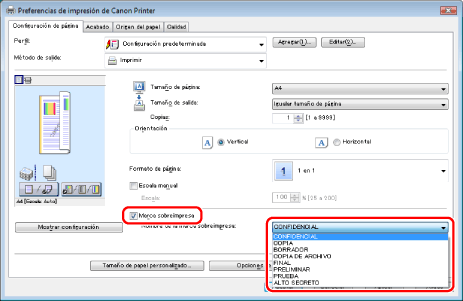 Puede imprimir una marca sobreimpresa (como "CONFIDENCIAL" o "COPIA") en un documento creado desde una aplicación. Asimismo, puede guardar marcas sobreimpresas personalizadas además de las marcas predefinidas.