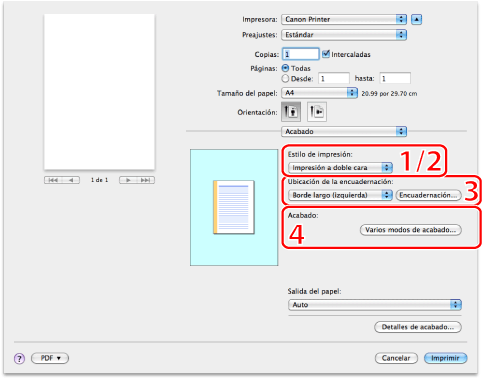 Imprime en una o en las dos caras del papel. El valor predeterminado de [Estilo de impresión] es [Impresión a doble cara] (consulte "Impresión a una cara y a doble cara").
