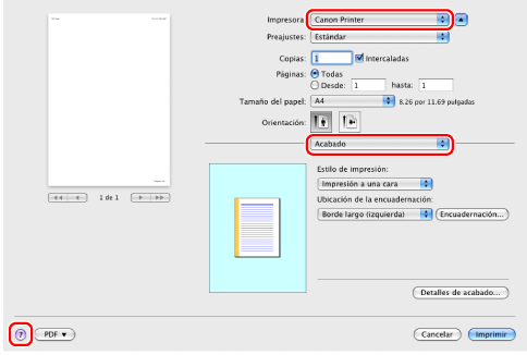 Seleccione su impresora en [Impresora] → seleccione un panel de preferencias → haga clic en [].