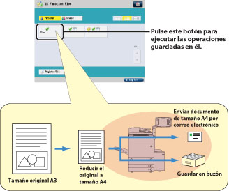 Por ejemplo, se puede leer un original A3, reducirlo a tamaño A4 y después enviarlo a un cliente por correo electrónico al tiempo que se guarda una copia de seguridad del archivo en un buzón, todo ello simplemente pulsando un botón.