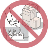 如果踩踏电源线、用装订针固定电源线或将重物置于其上,可能会损坏电源线。继续使用损坏的电源线可能会引发火灾或触电等事故。