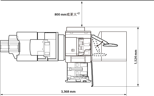 *1 如果安装一个或多个以下组件,确保提供至少800 mm大小的空间:“折纸组件-G1”、“文件插页器-H1”或“多纸盒纸柜-A1”。