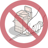 请小心不要让液体溅入本机或让任何异物(如纸夹或装订针)掉入本机内。如果异物与本机内的电气部件接触,可能会引起短路并且导致火灾或触电事故。