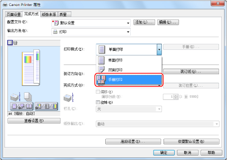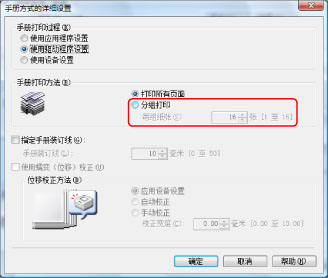 在单击[手册]后显示的[手册方式的详细设置]对话框,可以指定手册的详细设置(如布局等)。
