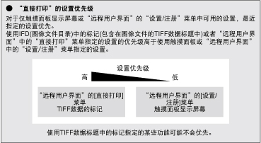 对于只能在触摸面板显示屏幕或“远程用户界面”上使用的设置,最新指定的设置优先。