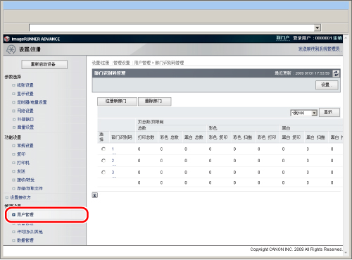 “部门识别码管理”设置与通过按本机操作面板上“设置/注册”的[用户管理]→[部门识别码管理]可用的设置相同。有关使用操作面板指定“部门识别码管理”设置的说明和“部门识别码管理”的详细信息,请参阅“部门识别码管理”。